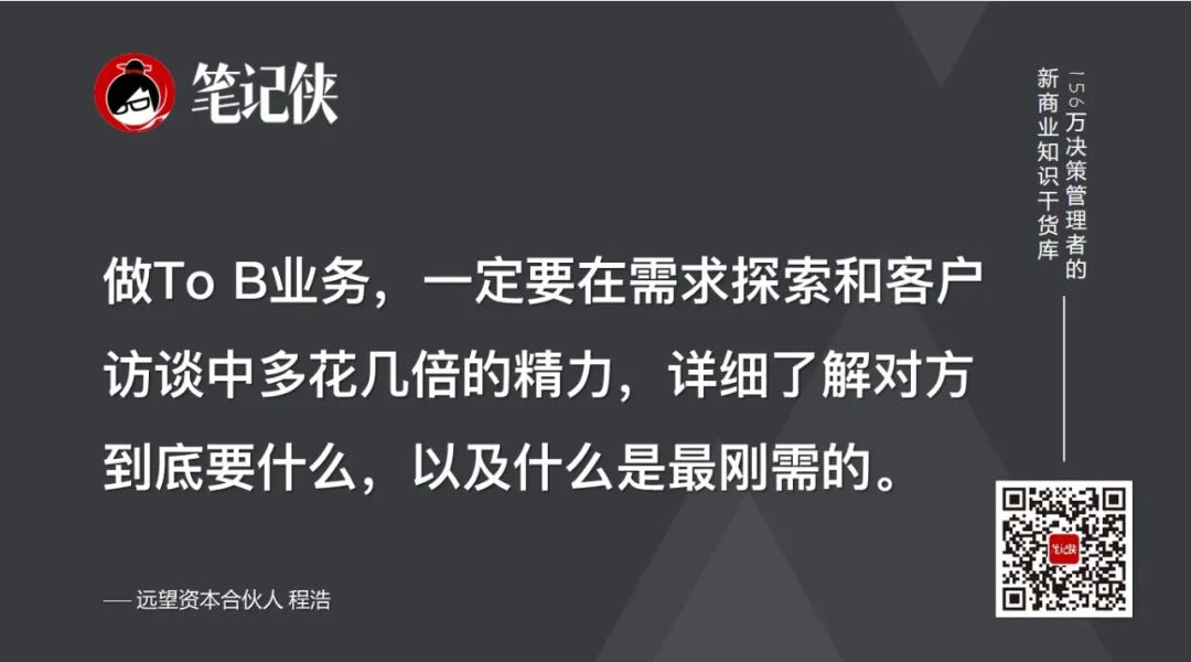 但对于To B来讲,大多数情况下创业者自己不是核心用户,你满足的是别人的需求,所以你对需求的把握天然就要远很多。
